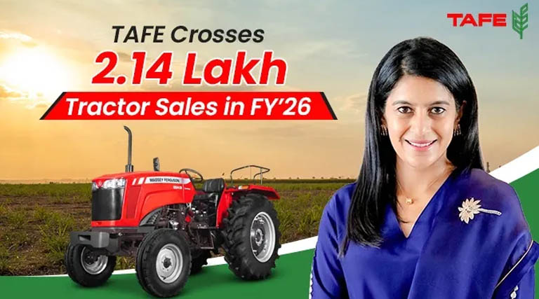 03 अप्रैल 2026, चेन्नई: ट्रैक्टर्स एंड फार्म इक्विपमेंट लिमिटेड ने वित्त वर्ष 2025-26 में 2,14,951 ट्रैक्टर बिक्री दर्ज की, मार्च में 37.4 प्रतिशत वृद्धि – ट्रैक्टर्स एंड फार्म इक्विपमेंट लिमिटेड (टीएएफई) ने वित्त वर्ष 2025-26 में कुल लगभग 2,14,951 ट्रैक्टरों की बिक्री दर्ज की, जो कंपनी के इतिहास में अब तक का सर्वोच्च स्तर है।