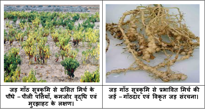 मिर्च की फसल में जड़ गांठ सूत्रकृमि (Meloidogyne incognita) एक महत्वपूर्ण कीट है, जिससे लगभग 11–35% तक उत्पादन हानि हो सकती है। यह कीट मिट्टी में रहता है और पौधों की जड़ों में गांठें बनाता है।