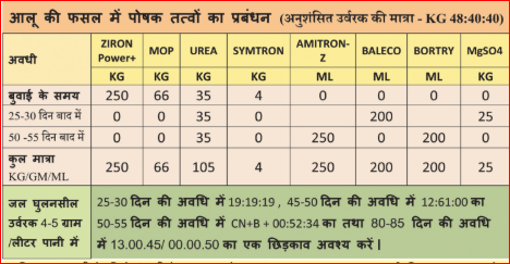 आलू की फसल में पोषक तत्व प्रबंधन (अनुशंसित उर्वरक की मात्रा KG 48 :40 :40 ) – बुवाई के समय महावीरा जिरोन पावर प्लस 250 किलो, एमओपी 66 किलो और यूरिया 35 किलो और सिमट्रॉन 4 किलो का इस्तेमाल करना चाहिए। फिर 25 -30 दिन के बाद 35 किलो यूरिया और 25 किलो मैग्नीशियम सल्फेट और 200 मिलीलीटर बेलेको का प्रयोग करना चाहिए। 50 -55 दिन के बाद यूरिया 35 किलो, एमिट्रोन जेड 250 मि .ली.और बोरट्री 200 मिली लीटर का इस्तेमाल करना चाहिए। इसके अलावा जल घुलनशील उर्वरक 4 -5 ग्राम / लीटर पानी में 25 -30 दिन की अवधि में 19 :19 :19 , 45 -50 दिन की अवधि में 12 :61 :00 का , 50 -55 दिन की अवधि में सीएन +बी+00 :52 :34 तथा 80 -85 दिन की अवधि में 13 :00 :45 / 00 : 00 : 50 का छिड़काव अवश्य करें। इसके बेहतर परिणाम मिलते हैं। अधिक जानकारी के लिए कंपनी के कस्टमर केयर नंबर 8956926412 पर सम्पर्क करें।