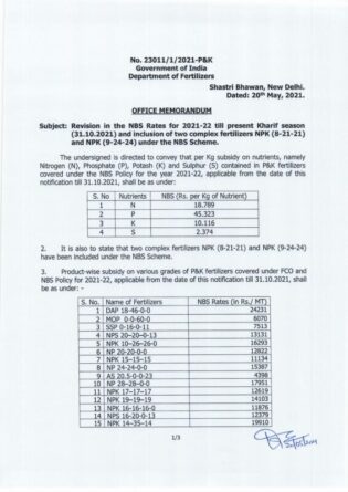 सरकार यह सुनिश्चित करने के लिए हर संभव प्रयास कर रही है कि किसानों को मूल्य वृद्धि का खमियाजा न भुगतना पड़े। केंद्र सरकार रासायनिक उर्वरकों पर सब्सिडी के लिए हर साल लगभग 80,000 करोड़ रुपये खर्च करती है। एनबीएस नीति के तहत शामिल पीएंडके उर्वरकों के विभिन्न ग्रेडों पर उत्पादवार सब्सिडी (20.05.2021 से 31.10.2021 तक लागू) निम्नानुसार होगी : –