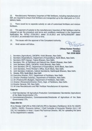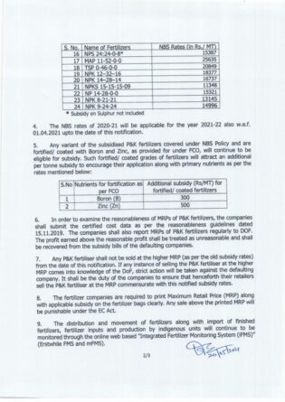 इस अधिसूचना की तिथि से पीएंडके उर्वरकों की बिक्री अधिक एमआरपी (पुरानी सब्सिडी दरों के अनुसार) पर नहीं की जाएगी। यदि पीएंडके उर्वरक को अधिक एमआरपी पर बेचने का कोई मामला डीओएफ के संज्ञान में आता है तो चूककर्ता कंपनी के खिलाफ सख्त कार्रवाई की जाएगी। यह सुनिश्चित करना कंपनियों की जिम्मेदारी होगी कि अब उनके खुदरा विक्रेता इस अधिसूचित सब्सिडी दरों के अनुरूप एमआरपी पर ही पीएंडके उर्वरकों की बिक्री करें।इस अधिसूचना के माध्यम से दो काम्प्लेक्स फ़र्टिलाइज़र एनपीके 8-21-21, एनपीके 9-24-24 को भी शामिल कर लिया गया है.
