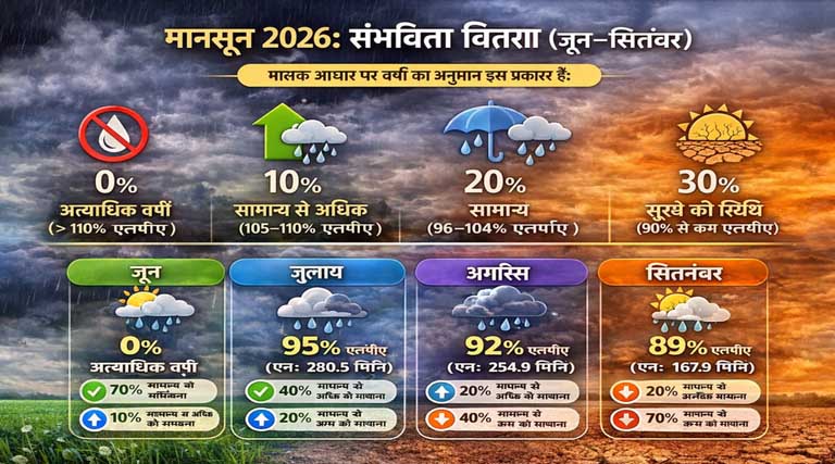 08 अप्रैल 2026, नई दिल्ली: स्काइमेट का पूर्वानुमान: 2026 में भारत में सामान्य से कम रहेगा मानसून, 94% एलपीए का अनुमान – स्काइमेट वेदर (Skymet Weather) ने वर्ष 2026 के लिए मानसून पूर्वानुमान जारी किया है, जिसमें दक्षिण-पश्चिम मानसून को सामान्य से कम रहने का अनुमान जताया गया है। जून से सितंबर की चार माह की अवधि के लिए कुल वर्षा 868.6 मिमी के दीर्घकालिक औसत (एलपीए) का 94% (±5%) रहने की संभावना है। यह अनुमान 90–95% एलपीए की श्रेणी में आता है। जनवरी 2026 में जारी अपने पूर्व संकेत में भी स्काइमेट ने मानसून को कमजोर रहने का आकलन किया था, जिसे अब बरकरार रखा गया है।