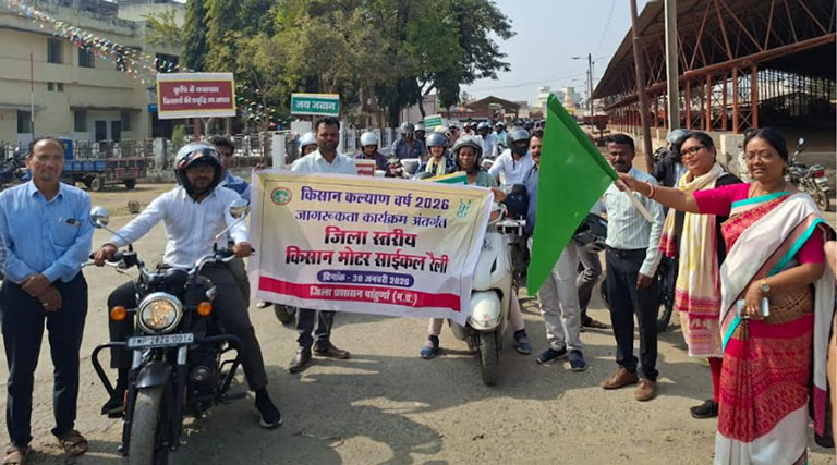 31 जनवरी 2026, (उमेश खोड़े, कृषक जगत, पांढुर्ना): किसान जागरूकता के लिए पांढुर्ना में निकाली मोटरसाइकिल रैली – मध्यप्रदेश शासन के निर्देशानुसार किसान कल्याण वर्ष 2026 की व्यापक जागरूकता के उद्देश्य से शुक्रवार को पांढुर्ना जिले में एक मोटरसाइकिल रैली का आयोजन किया गया। यह रैली कृषि उपज मंडी प्रांगण से प्रारंभ होकर तीन शेर चौक, तार बाजार, शाह पेट्रोल पंप, बस स्टैंड होते हुए पुनः कृषि उपज मंडी प्रांगण में संपन्न हुई। रैली में लगभग 150 किसानों, जनप्रतिनिधियों तथा अधिकारी-कर्मचारियों ने सहभागिता कर इसे सफल बनाया। मोटरसाइकिल रैली के माध्यम से किसान कल्याण वर्ष 2026 के प्रति व्यापक जन जागरूकता का संदेश दिया गया।