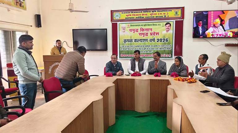 14 जनवरी 2026, मुरैना: मुरैना जिले के विकास खण्डों में कृषि रथों को हरी झंडी दिखाकर रवाना किया – कृषक कल्याण वर्ष 2026 मनाए जाने के परिप्रेक्ष्य में प्राप्त निर्देशों के अनुसार मुरैना जिले के 7 विकास खंडों में जनप्रतिनिधियों के द्वारा हरी झंडी दिखाकर कृषि रथ रवाना किया गया। कृषि रथ ग्राम पंचायत में जाकर उर्वरक वितरण हेतु ई-विकास प्रणाली के तहत की ई- टोकन, मृदा स्वास्थ्य कार्ड, प्राकृतिक खेती, उन्नत कृषि वैज्ञानिक पद्धति तथा समसामयिक की जानकारी कृषकों को देंगे।