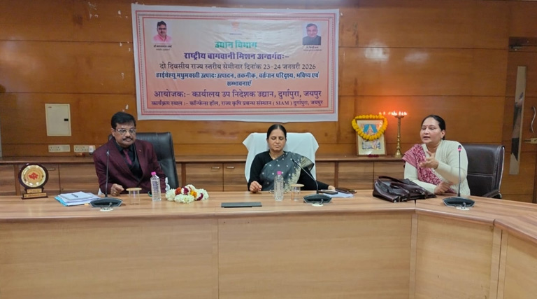 24 जनवरी 2026, जयपुर: मधुमक्खी पालन से किसानों की आय बढ़ाने की अपार संभावनाएं : राजपाल श्रीमती मंजू – राजस्थान में मधुमक्खी पालन को एक लाभकारी, टिकाऊ एवं रोजगारोन्मुख कृषि व्यवसाय के रूप में विकसित करने की दिशा में महत्वपूर्ण पहल करते हुए कृषि प्रबंध संस्थान, दुर्गापुरा में शुक्रवार को दो दिवसीय राज्य स्तरीय सेमिनार का शुभारंभ किया गया। सेमिनार की अध्यक्षता प्रमुख शासन सचिव कृषि एवं उद्यानिकी श्रीमती मंजू राजपाल ने की।