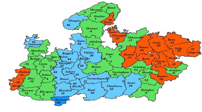 पश्चिमी मध्य प्रदेश -भिंड (मिहौना – 108, रौन – 106, लहार – 80, म्हगांव – 30, सिटी – 22, मौ – 12, बीज निगम एआरजी – 11, गोहद – 7.2, गोरमी – 5, अटेर – 4),देवास (बागली – 108, सोनकच्छ – 68, हा टपीपल्या – 50, उदयनगर – 33.6, टोंकखुर्द – 18, सतवास – 14, सिटी – 13, कन्नौद – 2),नर्मदापुरम (पचमढ़ी – 94.4, सिवनी-मालवा – 23, इटारसी – 15.4, पिपरिया – 3.6, सोहागपुर – 1.4,डोलरिया – 1.2, सिटी – 0.2),बैतूल (प्रभातपट्टन – 92.4, आठनेर – 57.1, शाहपुर – 39, मुलताई – 35, सिटी – 34.4, भैंसदेही – 14, घोड़ाडोंगरी – 12, चिचोली – 10.4, आमला – 7, भीमपुर – 5), सीहोर (जावर – 65, आष्टा – 34, रेहटी – 2.2, एग्रो ओब्स – 0.5),शाजापुर (सिटी – 46.2, कालापीपल – 17, शुजालपुर – 15, मो.बड़ोदिया – 2),उज्जैन (नागदा – 45, माकड़ौन – 45, सिटी – 29, झार्ड़ा – 26, तराना – 18, घट्टिया – 18, ता.मं. वेधशाला – 16.4, खाचरौद – 15, महिदपुर – 10, बड़नगर – 8),दतिया (सेवढ़ा – 44, इंदरगढ़ – 7, सिटी – 6.8, भांडेर – 3),रतलाम (जावरा – 37, सिटी – 23, आलोट – 20, सैलाना – 7, बाजना – 2, पिपलौदा – 1),ग्वालियर (डबरा – 36, सिटी – 12.7, चिनौर – 7.2, घाटीगांव – 3.3, भितरवार – 2.3),हरदा (खिरकिया – 30.2, टिमरनी – 7.8, सिटी – 3.8),खण्डवा (पुनासा – 27, खालवा – 12, सिटी – 5.6, केवीके – 4, पंधाना – 3),मुरैना (एग्रो ओब्स – 25.3, सिटी – 25.2, जौरा – 13, कैलारस – 12, पोरसा – 10, अम्बाह – 2),इंदौर (सांवेर – 23.4, गौतमपुरा – 14.5, महू – 11, एयरपोर्ट – 10.4,एग्रो ओब्स – 4.2, देपालपुर – 3.5), आगर (बड़ौद – 23, सिटी – 2),मंदसौर(संजीत – 20, गरोठ – 12.2, भावगढ़ – 9.2, शामगढ़ – 9.2, मल्हारगढ़ – 7, भानपुरा – 2.4, सीतामऊ – 2.2, सिटी – 1),झाबुआ (पेटलावद – 15.2, सिटी – 1.8, एग्रो ओब्स – 1.4, राणापुर – 1),श्योपुर कलां (विजयपुर – 15, सिटी – 7.1, वीरपुर – 5, बड़ौदा – 4),बुरहानपुर (खकनार – 15, सिटी – 6.5, नेपानगर – 4.6),खरगोन (सनावद – 14, बड़वाह – 13, भीकनगांव – 3, कसरावद – 2),नीमच (मरूखेड़ा ईस्ट – 11, मनासा – 7, सिटी वेस्ट – 4),राजगढ़ (पचौर – 9.2, सिटी केवीके 5.5, नरसिंहगढ़ – 4),शिवपुरी (खनियाधाना – 7, नरवर – 7, पोहरी – 6, पिछोर – 4, करैरा – 3.5, पिपरसमा केवीके – 1.5, सिटी – 1.3),बड़वानी (चाचरीयापाटी – 7, वरला – 3.1, पानसेमल – 2),अशोकनगर (चंदेरी – 7, आंवरी केवीके – 1),धार (तिरला – 6, सिटी – 3.3, बदनावर – 3, पीथमपुर – 2.2),अलीराजपुर (कट्ठीवाड़ा – 6, उदयगढ़ – 1.2, जोबट – 1),विदिशा (सिरोंज – 2, पठारी – 1, कुरवाई एन आर 1),रायसेन (बेगमगंज – 1),गुना (सिटी – 0.4),पचमढ़ी – 94.4, धोलावाड़ – 2.0, गांधीसागर – 1.2, महेश्वर – 1.0 मिमी वर्षा दर्ज़ की गई।