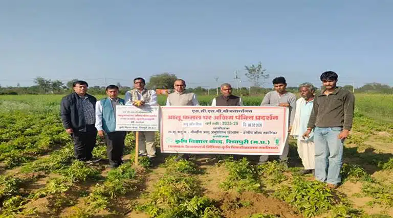 एस.सी.एस.पी. योजनांतर्गत आलू की उन्नत प्रजाति कुफरी पुखराज एवं कुफरी चन्द्रमुखी के प्रदर्शन रबी 2025-26 में कृषि विज्ञान केंद्र शिवपुरी के समन्वय में विकासखण्ड कोलारस के ग्राम गिलगवां, देहरदा, अमरपुर विकासखंड नरवर के ग्राम मायारामपूरा, बीलोनी, किशनपुर, पनघटा, निजामपुर, मगरौनी एवं विकासखण्ड शिवपुरी के ग्राम रातौर, किरौली और पिपरसमा में से 150 कृषकों के प्रक्षेत्र पर लगाए गए। जिनका उद्देश्य आलू की रोग प्रतिरोधी उन्नत प्रजातियों का क्षेत्र में वृहद फैलाव और वैज्ञानिक उत्पादन तकनीक से आलू फसल की पैदावार के बारे में तकनीकी का हस्तांतरण करना है।