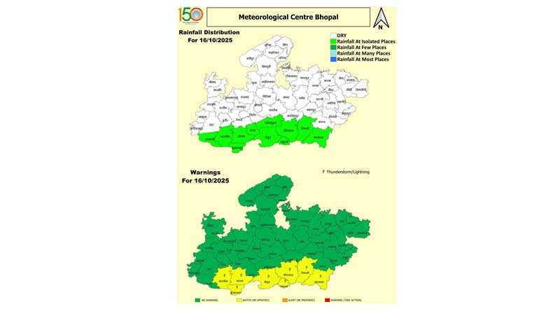 16 अक्टूबर 2025, इंदौर: दक्षिण – पश्चिम मानसून की देश से हुई विदाई – मौसम केंद्र , भोपाल से मिली जानकारी के अनुसार पिछले 24 घंटों के दौरान मध्यप्रदेश के जबलपुर संभाग के जिलों में कहीं- कही वर्षा दर्ज़ की गई एवं शेष सभी संभागों के जिलों में मौसम मुख्यतः शुष्क रहा।