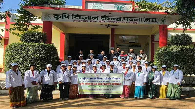 20 दिसंबर 2025, पन्ना: पन्ना में कृषि सखी प्रशिक्षण का हुआ शुभारंभ – राष्ट्रीय प्राकृतिक खेती मिशन अंतर्गत जिले में प्राकृतिक खेती को बढ़ावा देने के उद्देश्य से कृषि विज्ञान केंद्र पन्ना एवं परियोजना संचालक आत्मा, किसान कल्याण तथा कृषि विकास विभाग पन्ना के संयुक्त तत्वावधान में गत दिनों कृषि विज्ञान केंद्र पन्ना में कृषि सखियों के पांच दिवसीय प्रशिक्षण कार्यक्रम का शुभारंभ हुआ। कार्यक्रम के मुख्य अतिथि जवाहरलाल नेहरू कृषि विश्वविद्यालय, जबलपुर के प्रमंडल सदस्य श्री संजीव खरे थे। इस मौके पर उपसंचालक कृषि श्री ओ.पी. तिवारी, केंद्र के वरिष्ठ वैज्ञानिक एवं प्रमुख डॉ. पी.एन. त्रिपाठी, एवं कृषि सखियां मौजूद थीं।