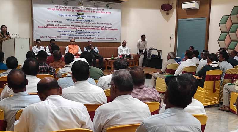 20 सितम्बर 2025, (उमेश खोड़े, पांढुर्ना): सौंसर में संतरा उत्पादन में अच्छी कृषि पद्धतियों पर प्रशिक्षण आयोजित – जवाहरलाल नेहरू कृषि विश्वविद्यालय , कृषि विज्ञान केंद्र ,चंदनगांव ( छिंदवाड़ा ) द्वारा गत दिनों संतरा उत्पादन में अच्छी कृषि पद्धतियों पर क्षमता विकास कार्यक्रम के तहत सौंसर में एक दिवसीय प्रशिक्षण आयोजित किया गया। प्रशिक्षण में संतरा उत्पादकों को भाकृअप -केंद्रीय नींबू वर्गीय फल अनुसन्धान संस्थान , नागपुर ( महाराष्ट्र ) के वैज्ञानिकों द्वारा संतरा उत्पादन के क्षेत्र में नवीनतम तकनीक एवं नवाचारों से अवगत कराया गया।